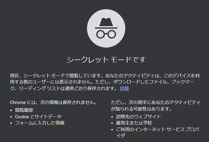 「Incognitoモードの利用にあたっては、ブラウザを閉じるときに、閲覧履歴や検索履歴、ならびにクッキーが消去されるため、ほかのユーザーが次にブラウザを開いても、プライバシーが保たれる」