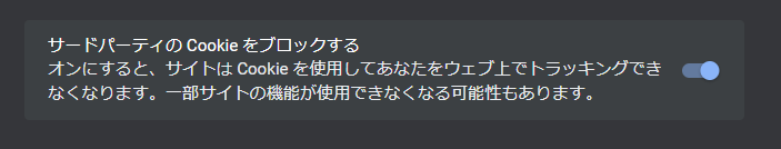 シークレットモードで閲覧する際は「サードパーティのCookieをブロックする」がONになっているか確認しましょう。下記の設定項目はシークレットモードを起動させた最初の画面にあります。