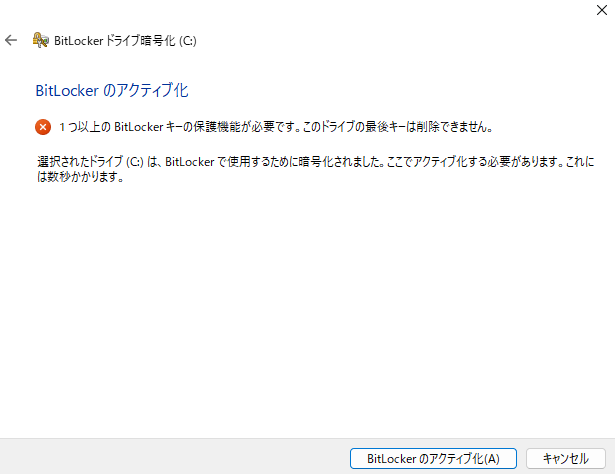 1つ以上の BitLockerキーの保護機能が必要です。このドライブの最後キーは削除できません。